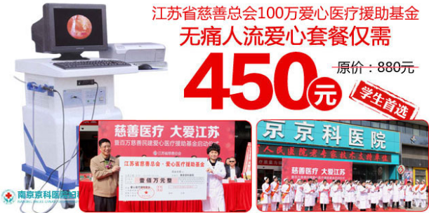 如果你是学生,我知道你的经济能力一定有限,你肯定很想做一种又便宜又安全的人流手术?亲,对不起,450元已经是我们综合考虑在保证安全与手术质量前提下能给的最大优惠,这是我 们跟江苏省慈善总会合作的援助活动,原价是880元的无痛人流爱心套餐(套餐包含:妇检+白带常规+出凝血时间+血常规+尿常规+心电图+BV+阴道镜+手术费+一次性材料费+麻醉费+全程心电监护费+术后 消炎+术后营养餐),另外妇儿堂还有3-5种高端人流套餐针对经济条件不同的女性自由选择,高级VIP人流套餐满足高要求的你。你现在可以点击在线咨询 或拨打我的电话025-86896551进行申请,江苏省慈善总会每天只限援助15个名额,活动截至本月底。请现在就采取 行动,因为一旦你离开这个页面,你就可能永远错过了这次难得的优惠活动。